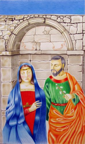 Michieletto da Lanuvio, Il fidanzamento (San Giuseppe) pastelli su carta, cm 29,5x42 ESPOSIZIONI 2023 - 'Giuseppe: padre, sposo, profugo' mostra inserita nella fiera KOINE di Vicenza L'opera č stata donata alla Chiesa Ucraina |
